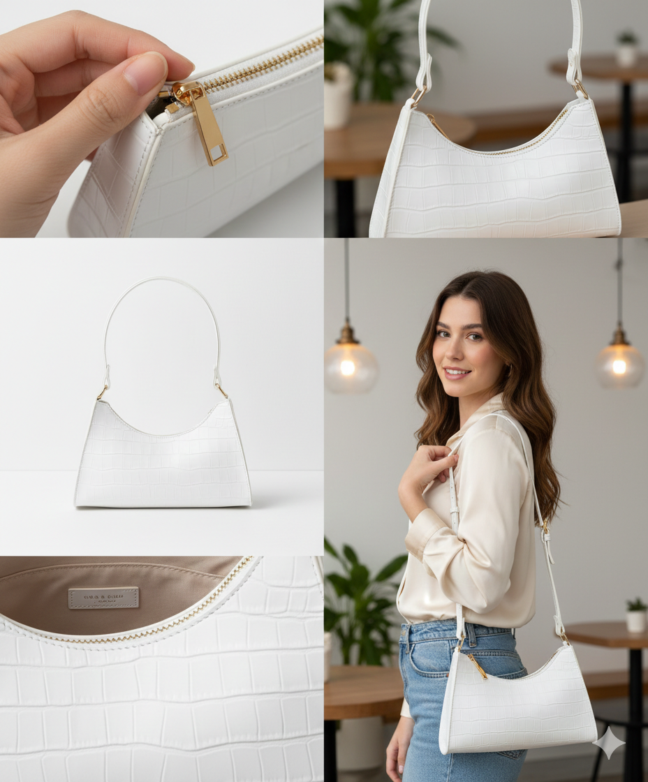Este lindo modelo redefine o conceito de shoulder bag. Seu formato baguette com topo curvado adapta-se perfeitamente à silhueta do corpo, proporcionando conforto e um visual alongado. O design limpo é acentuado por uma alça fina e elegante, ideal para o uso no ombro com total segurança.