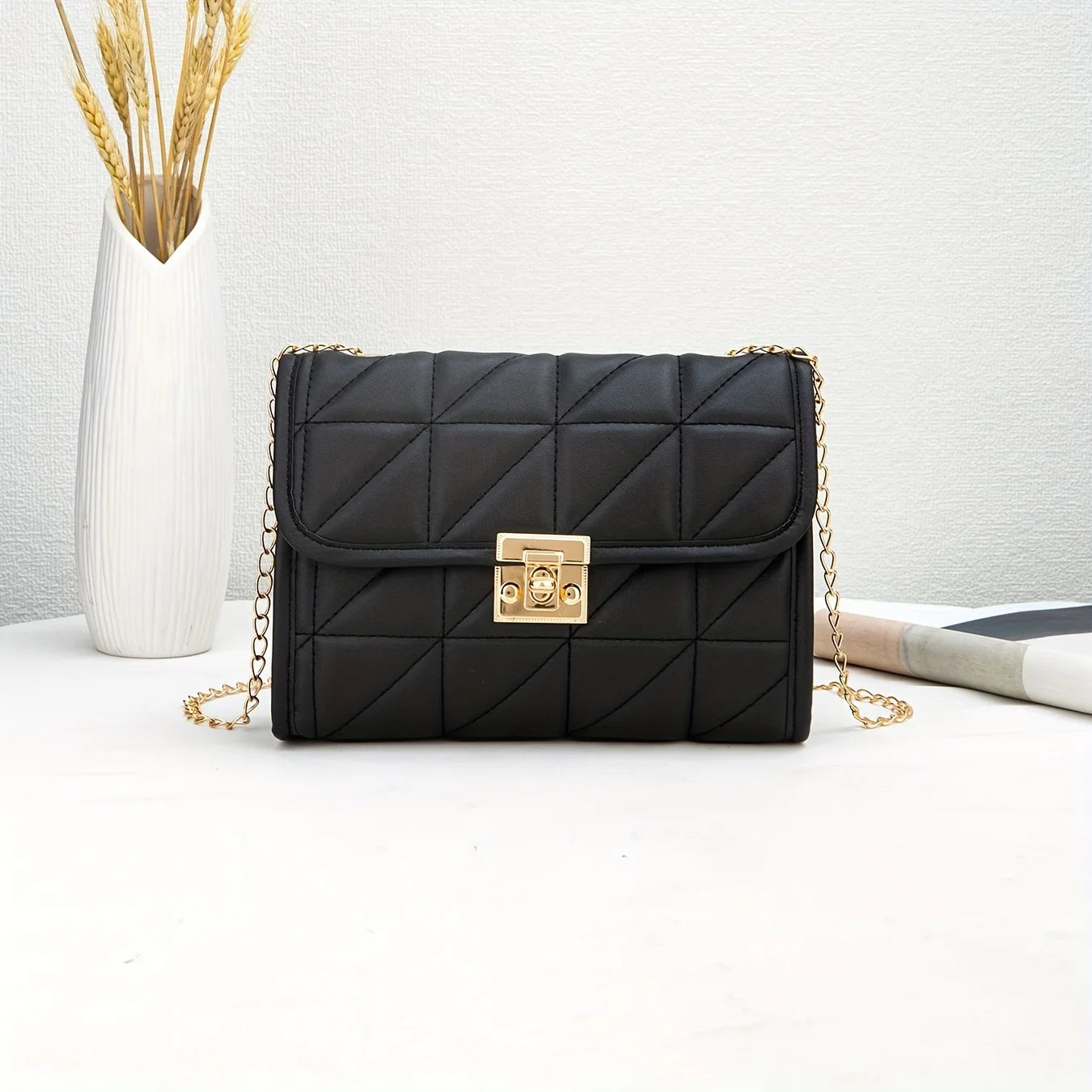 Esta linda bolsa apresenta um acabamento em matelassê geométrico, com costuras precisas que formam triângulos harmoniosos. O fecho frontal em push-lock dourado não é apenas funcional, mas funciona como uma joia na peça. A alça em corrente de elos finos permite um uso confortável no ombro, adicionando um brilho extra ao seu visual.