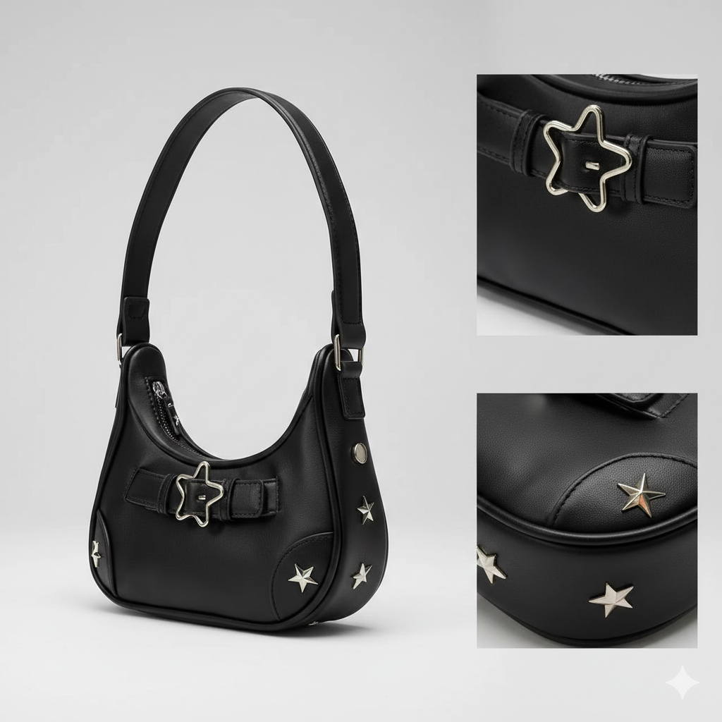 Aplicações Metálicas: Rebites laterais em formato de estrela que reforçam a identidade visual única da peça.